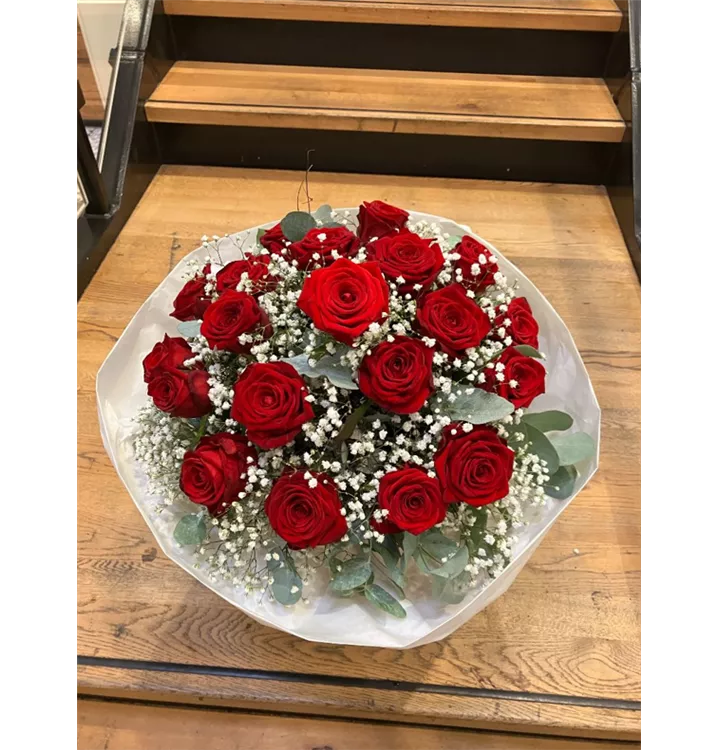 Rote Rosen, Eukalyptus und Schleierkraut – kraftvoll im Kontrast, fein in der Komposition.