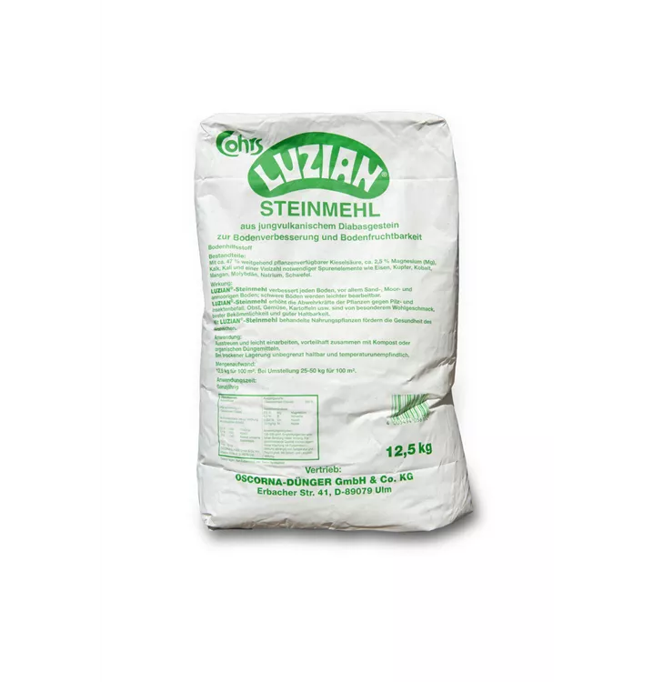 Jährliche Ausbringung: 12,5 kg/100 qm, Bei der ersten Anwendung: 25 - 50 kg/100 qm, Luzian-Steinmehl ist ganzjährig anwendbar.