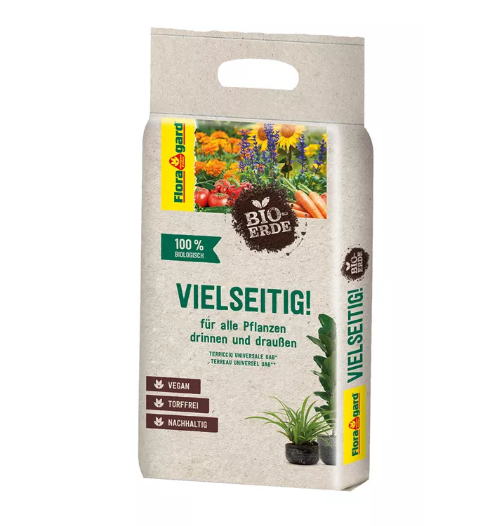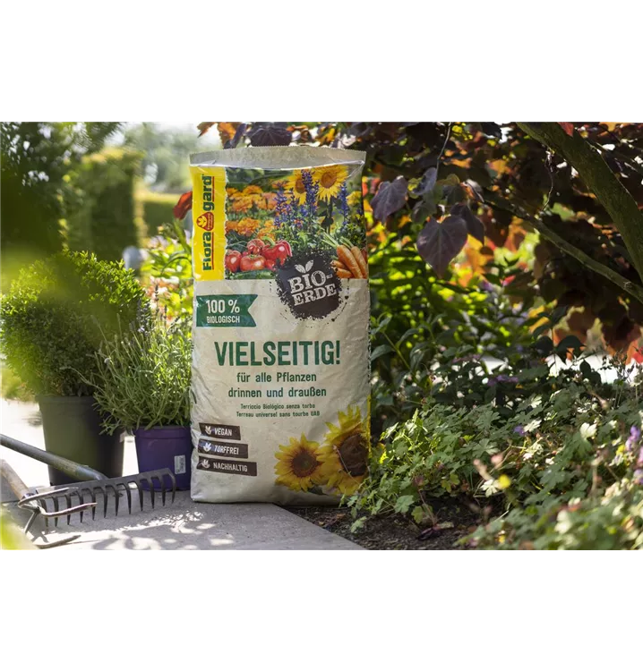 Die Floragard Bio-Erde VIELSEITIG! Doch warum „VIELSEITIG“? Diese torffreie und vegane Bio-Erde kannst du für fast alle Pflanzen verwenden – egal ob indoor oder outdoor, im Beet oder im Gefäß. Dadurch ist sie echt vielseitig! Ideal für prächtige und natürliche Blühpflanzen in deinem Zimmer, auf deinem Balkon oder im Garten – für deinen grünen Rückzugsort vom stressigen Alltag. Die optimale Basis für köstliches und gesundes Bio-Gemüse aus deiner eigenen Ernte. Auch für Grünpflanzen, Palmen, Kakteen und andere Zimmerpflanzen geeignet. Natürlich und vegan - unbedenklich für Mensch und Tier Natürlichkeit ist dir wichtig? Dann hast du dich für die richtige Erde entschieden! Die Floragard Bio-Erde VIELSEITIG! besteht zu 100 % aus natürlichen Rohstoffen. Für 4 bis 6 Wochen versorgt der vegane Bio-Dünger Flora Veggie Power deine Pflanzen mit allen wichtigen Nährstoffen – das bedeutet gesundes Wachstum, prächtige Blüten und eine reiche Ernte, alles ohne tierische Inhaltsstoffe. Der vegane Dünger darf auch im biologischen Landbau sowie im kontrolliertem ökologischem Land- und Gartenbau angewendet werden. Deswegen ist diese Erde unbedenklich für dich, deine Familie, deine Haustiere und die Tiere in deinem Garten.