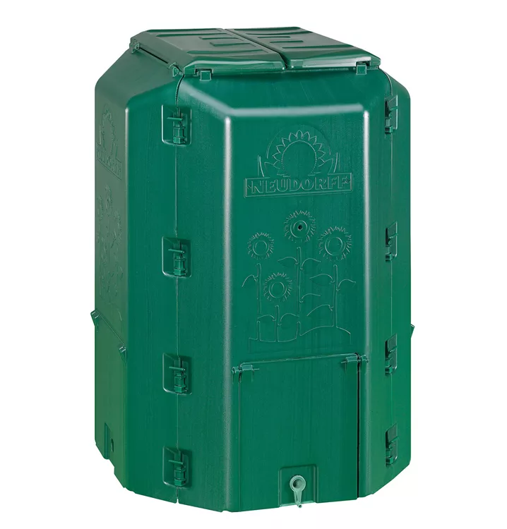 Komposter mit Wärmedämmung durch doppelwandige Konstruktion. 4-teilig; 8-eckige Form mit einer großen Entnahmeklappe am Boden. Stabile, wetterfeste Konstruktion mit Recycling-Kunststoff. Inhalt 530 Liter.
