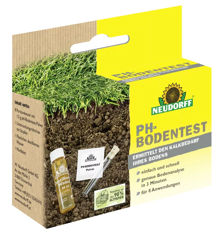 Zur Ermittlung des Kalkbedarfs für Garten und Rasen. Sichere Bestimmung des pH-Wertes durch Farbreaktion. Faltschachtel mit Utensilien und Beipackzettel.