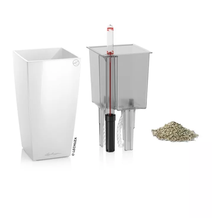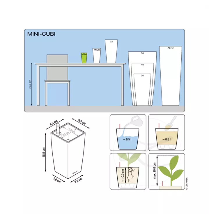 Die kubisch geformten Tischgefäße MINI-CUBI und MAXI-CUBI sind mit Blüh- oder Zimmerpflanzen bestückt eine stilvolle Dekoration für jeden Anlass. Als Blickfang in bunten Farben oder dezent in neutralen Tönen komplettieren sie kreative Arrangements auf der Festtafel oder sorgen für eine stets grüne Deko auf der Fensterbank oder auf dem Schreibtisch. Dank des integrierten Bewässerungssystems werden die Pflanzen zuverlässig mit der Menge an Wasser und Nährstoffen versorgt, die sie für ein gesundes Wachstum benötigen.