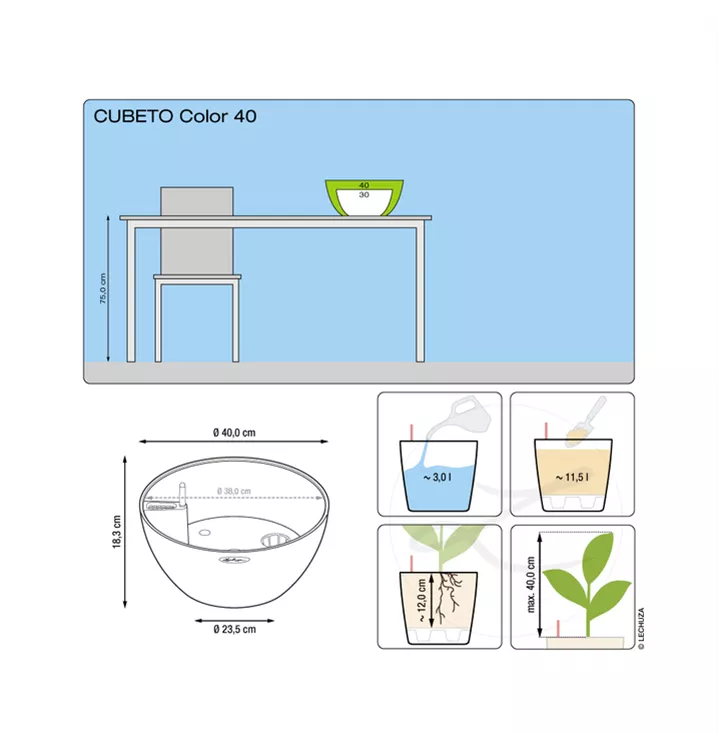 LECHUZA CUBETO Stone ist in den Farbtönen sandbeige, graphitschwarz und steingrau sowie in den Größen 30 cm und 40 cm als „All-in-One Set“ mit Pflanzgefäß, Pflanzeinsatz, Wasserstandsanzeiger sowie Pflanzsubstrat LECHUZA-PON erhältlich.