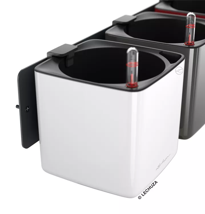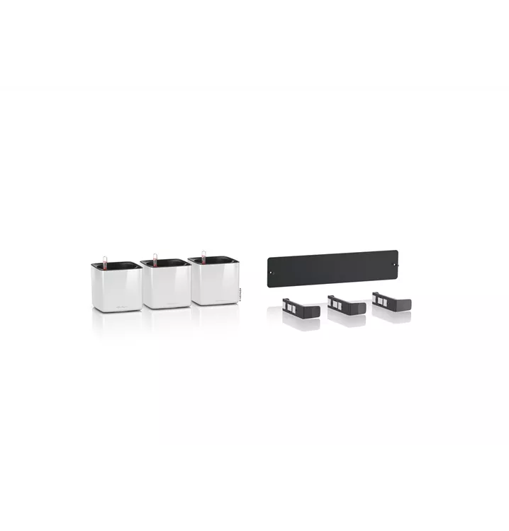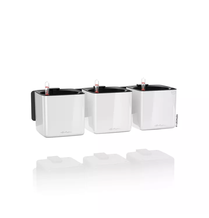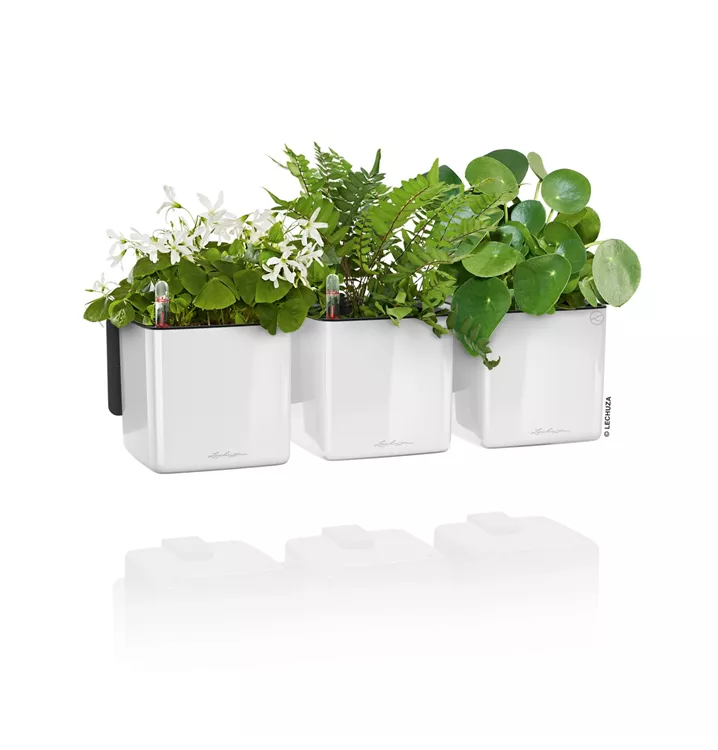 Mit dem Green Wall Home Kit Glossy von LECHUZA ist es ganz einfach möglich, eine eigene lebendige Green Wall zu gestalten. Dafür entsteht mit nur wenigen Handgriffen aus der Metallleiste, den Magnethaltern und den LECHUZA-Gefäßen CUBE Glossy 14 ein hängender Garten. Dank der extra starken und hochwertigen Magnete können die Gefäße einfach an der Metallleiste angebracht und jederzeit schnell ausgetauscht oder neu arrangiert werden. Der eigenen Kreativität sind mit dem Green Wall Home Kit keine Grenzen gesetzt. Die zuverlässige Bewässerung kümmert sich um die Versorgung der Pflanzen. Hierfür wird einfach ein Stick von unten in den Growpot gesteckt, dieser anschließend in das Pflanzgefäß eingesetzt und das Wasserreservoir aufgefüllt.  Perfekt für den eigenen vertikalen Indoor-Dschungel!