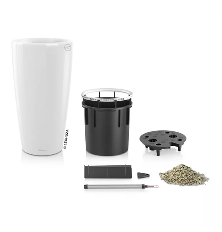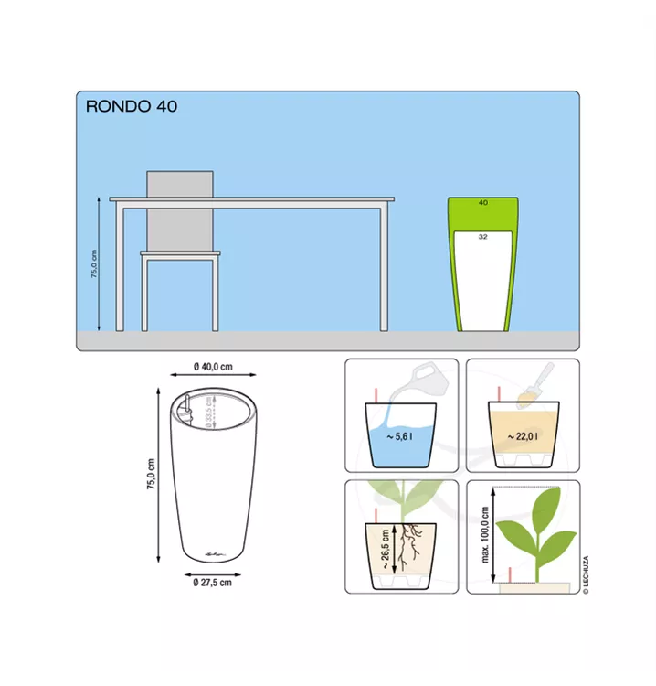 Die klassische Form des grazilen Pflanzgefäßes RONDO bringt Pflanzen optimal zur Geltung und rückt sie ins beste Licht. Skulpturenartig inszeniert verschönern sie Wohn- und Geschäftsräume in RONDO wie grüne Kunstwerke. Der Pflanzeinsatz mit pantentiertem Griffrahmen in Gefäßfarbe erleichtert den Austausch und die Pflege der Pflanzen in der gewohnten LECHUZA Qualität.