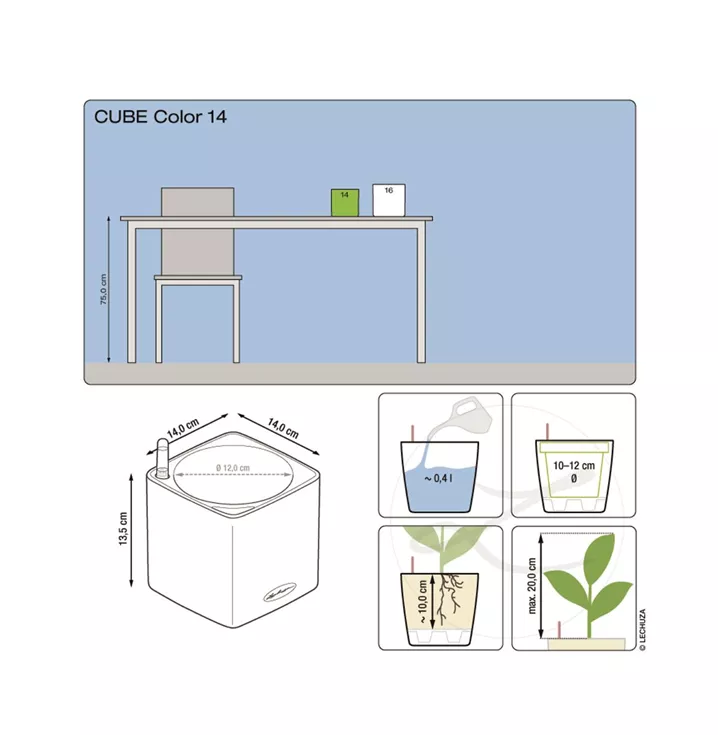 Über das Wasserreservoir werden die Pflanzen zuverlässig und individuell mit Feuchtigkeit versorgt. Ob mit 14 oder mit 17 Zentimetern Kantenlänge – in den Farbtönen weiß, schiefergrau und limettengrün lässt sich mit dem CUBE Color jede Fensterbank in einen kleinen Kräutergarten verwandeln. Der CUBE Color 14 ist ideal für alle Standard-Kräutertöpfe (10-12 cm Durchmesser).