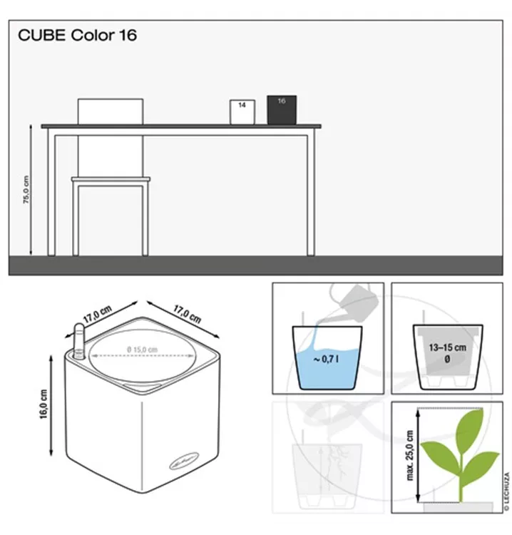 Über das Wasserreservoir werden die Pflanzen zuverlässig und individuell mit Feuchtigkeit versorgt. Ob mit 14 oder mit 17 Zentimetern Kantenlänge – in den Farbtönen weiß, schiefergrau und limettengrün lässt sich mit dem CUBE Color jede Fensterbank in einen kleinen Kräutergarten verwandeln. Der CUBE Color 14 ist ideal für alle Standard-Kräutertöpfe (10-12 cm Durchmesser).