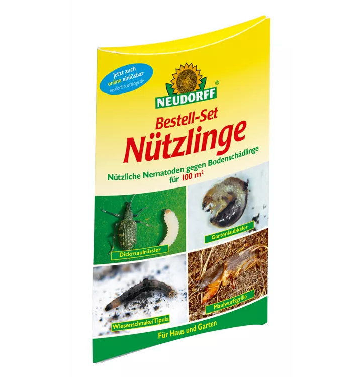 Bestell-Set mit Bestellgutschein für Nematoden gegen Dickmaulrüssler, Gartenlaubkäfer, Wiesenschnaken und Maulwurfsgrillen. Für maximal 100 qm Fläche. Voraussetzung ist eine Bodentemperatur von mindestens 12 Grad.