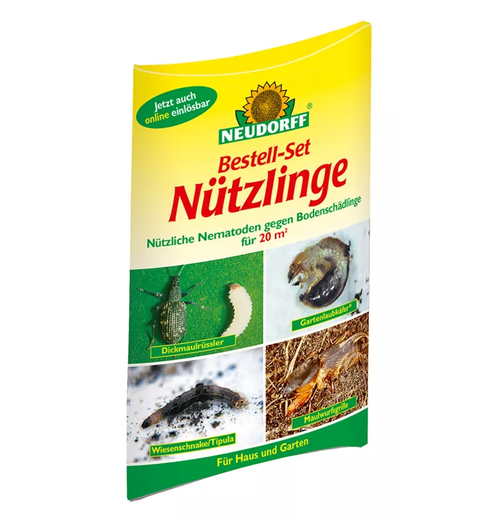 Bestell-Set mit Bestellgutschein für wahlweise einen der folgenden Nützlinge: - SC-Nematoden gegen Maulwurfsgrillen und Wiesenschnaken - HM-Nematoden gegen Dickmaulrüssler und Gartenlaubkäfer Für maximal 20 qm Fläche.