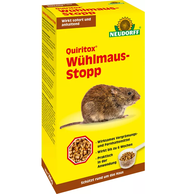 Ist ein auslegefertiges Granulat mit Dosierlöffel. Vertreibt Wühlmäuse aus Gängen, Nestern und Baue.Schnelle und anhaltende Wirkung. Biozid.