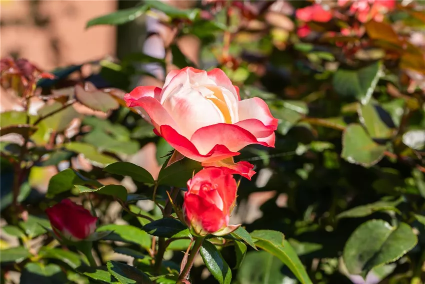 Edelrose, rot-weiß Wer seinen Garten neu oder umgestalten möchte, der hat die Wahl aus einer Vielzahl unterschiedlicher Pflanzen. Aber eine Pflanze sollte in keinem Garten fehlen: die Rose. Rosen kaufen war noch nie so einfach und bei der riesigen Auswahl findet sich mit Sicherheit für jeden Geschmack die passende Rose. Beim Rosen kaufen hat man nicht nur die Wahl zwischen den unterschiedlichsten Farben, sondern vor allem auch zwischen den verschiedensten Sorten. Denn Rose ist nicht gleich Rose. Wer besonders märchenhaftes Flair im Garten haben möchte, der sollte auf Kletterrosen zurückgreifen und mit diesen besonderen Pflanzen Hauswände, Spaliere oder Rosenbögen begrünen und zum Blühen bringen. Kletter- und Ramblerrosen sind besonders beliebt in Gärten, die viel Platz zum Klettern bieten. Wer buchstäblich die Nase nicht voll von duftenden Pflanzen im Garten bekommen kann, für den sind Wildrosen und Duftrosen die beste Wahl. Diese Blüten sehen nicht nur besonders hübsch aus, sie verströmen auch einen einmaligen Duft. Und was wäre ein Garten ohne Edelrosen? Diese besonderen Blüten dürfen nicht nur bei Rosenliebhabern nicht fehlen. Die Vielfalt ist groß und in den unterschiedlichsten Farben machen Strauchrose, Kletterrose, Duftrose und Co. eine richtig gute Figur.