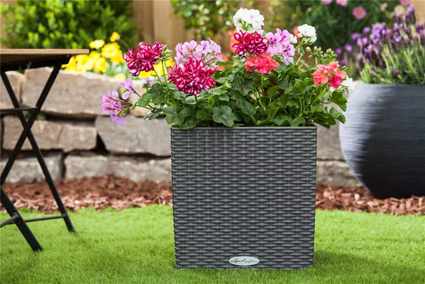 Blumenkasten mit Pelargonium Man möchte seiner Pflanze, etwa einer Zitrusfrucht, etwas Gutes tun und pflanzt sie in einen atmungsaktiven Terrakotta-Topf, hat dann aber das Problem, dass man den schweren Topf über Winter ins Haus schleppen muss. Das ist nur ein Beispiel dafür, dass verschiedene Materialien ihre jeweils eigenen Vor- und Nachteile haben. Holz ist natürlich, aber pflegeintensiv, Terrakotta witterungsbeständig, aber schwer, Kunststoff ist leicht, sieht aber oft nicht schön aus und geht recht schnell kaputt. Daneben halten modernere Materialien wie Edelstahl, Fiberglas und sogar der oft als reines Baumaterial verpönte Beton Einzug in die Gärten.