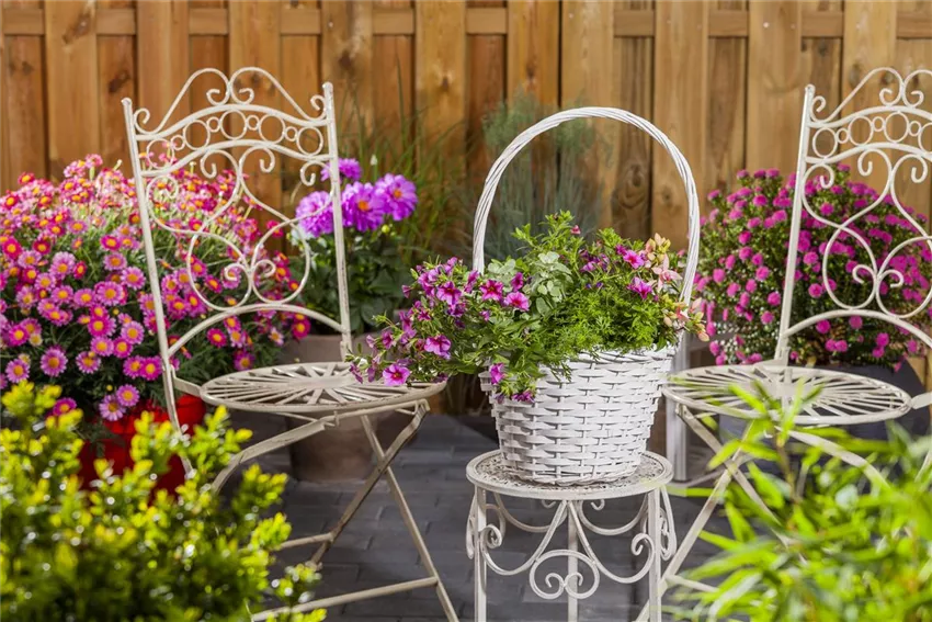 Was gibt es Schöneres, als mit der Familie oder Freunden bei Kaffee und Kuchen auf der Terrasse zu sitzen? Wenn dann auch noch die Sommerblumen um die Wette blühen, wird die Terrasse zum zusätzlichen Zimmer im Grünen. Viele einjährige Pflanzen und nicht winterharte Stauden harmonieren optisch schön miteinander. Wer die unterschiedlichen Blütezeiten der Sommerpflanzung berücksichtigt, kann sich so den ganzen Sommer über an dem Blütenmeer seiner Pflanzkünste erfreuen. Selbst Rosen fühlen sich im Kübel wohl und versprühen einen Hauch von Romantik.