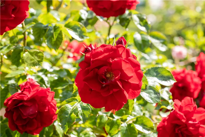 Kletterrose, rot Beim Rosen zurückschneiden kommt es aber nicht nur auf den richtigen Zeitpunkt und die richtige Technik an, sondern vor allem auch auf das passende Werkzeug. Ein erfolgreicher und verjüngender Rückschnitt steht und fällt mit der richtigen Schere. Im Gartencenter oder Fachhandel kann man spezielle Rosenscheren kaufen. Die Anschaffung lohnt sich, denn damit hat man das passende Werkzeug für die anspruchsvollen Pflanzen gefunden. Wichtig ist in erster Linie aber eine scharfe Klinge. Der Rückschnitt sollte abrupt und sauber passieren. Ausgefranste Pflanzenteile durch stumpfe Klingen verheilen langsamer und sind ein optimaler Ort für Krankheiten und Schädlinge. Apropos Krankheiten: wer seine Rosen zurückschneiden möchte, sollte stets sauberes und desinfiziertes Werkzeug verwenden. Besonders, wenn mit der Schere noch andere Pflanzen beschnitten werden, sollte das Werkzeug nach jedem Rückschnitt gründlich gereinigt werden. Rosen und andere Pflanzen sind nach dem Rückschnitt geschwächt und damit anfälliger für Krankheiten. Auch in die frischen Wunden können Erreger schneller eindringen. Deshalb bietet es sich an, beim Start ins neue Gartenjahr eine Grundreinigung der Gartenwerkzeuge und -geräte vorzunehmen. So gelingt der Start in die neue Saison und das Rosen zurückschneiden wird zum absoluten Kinderspiel.