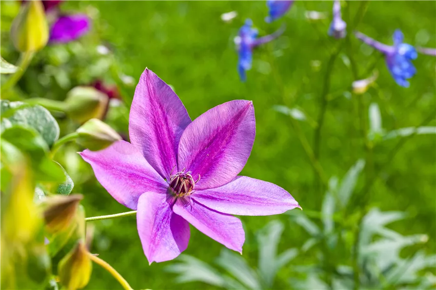 Clematis, lila Damit die Pflanzen nach dem Einsetzen in die Erde auch gut anwachsen können, sollte man sie vorbereiten. Beim Kletterpflanzen einpflanzen ist Vorbereitung die halbe Miete und kann dazu beitragen, dass sich die Pflanzen im Garten optimal entwickeln. Oft werden Kletterpflanzen in Plastiktöpfen geliefert oder angeboten. Ist das der Fall, sollte man den Plastiktopf vor dem Kletterpflanzen einpflanzen entfernen und die Wurzeln auflockern. Die sind nach der langen Zeit im Topf stark zusammengepresst worden und können mit den Händen auseinandergezogen werden. Wenn das nicht funktioniert, kann man den Ballen auch mit einem scharfen Messer einritzen. Kletterpflanzen im Topf können das ganze Jahr über ausgepflanzt werden, es sollte aber nicht frieren. Bevor die Kletterpflanze beim Einpflanzen in die Erde kommt, wird der Wurzelballen noch für mindestens 15 Minuten in einen Eimer mit Wasser gestellt. Vollgesogen haben sich die Wurzeln, wenn keine Luftblasen mehr aufsteigen. Dann kann die Pflanze in ein Pflanzloch gesetzt werden, dass doppelt so tief und breit sein sollte, wie der Wurzelballen selbst.