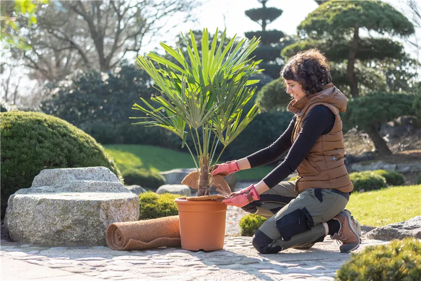 Überwinterung - Frau wickelt Kokosscheibe um eine Pflanze Besonders wichtig beim Frühjahrsputz im Garten ist es, den Schutz für den Winter von den Pflanzen und der Erde zu entfernen. Kübelpflanzen, die den Winter über draußen verbracht haben, wurden möglicherweise dick eingepackt, um Schnee und Eis im Winter standhalten zu können. Vor allem mediterrane Pflanzen wie Oleander oder Olivenbaum brauchen im Winter einen zusätzlichen Schutz, wenn sie nicht in ein Winterquartier umziehen konnten, weil vielleicht der Kübel zu groß und zu schwer zum Transportieren ist. Vlies und Kokosmatten werden von den Pflanzen entfernt, damit Blätter und Erde wieder Luft bekommen. Laub wird von den Beeten geholt, damit die Erde wieder atmen kann und frischen Sauerstoff bekommt. Und auch Tannenzweige werden aus den Kübel und aus den Beeten geholt, damit die Pflanzen wieder ausreichend Regen und Wärme abbekommen. Wichtig ist bei besonders empfindlichen Pflanzen aber, dass dies erst geschieht, wenn keine starken Fröste mehr zu erwarten sind. Denn es kann auch im Frühjahr nachts noch sehr kalt werden und die empfindlichen Wurzeln oder Pflanzenteile sollten auch dann keinen Frost bekommen. Beim Frühjahrsputz im Garten wird der Winterschutz also erst entfernt, wenn die Luft auch wirklich rein ist und die Pflanzen ein bisschen Kälte vertragen.