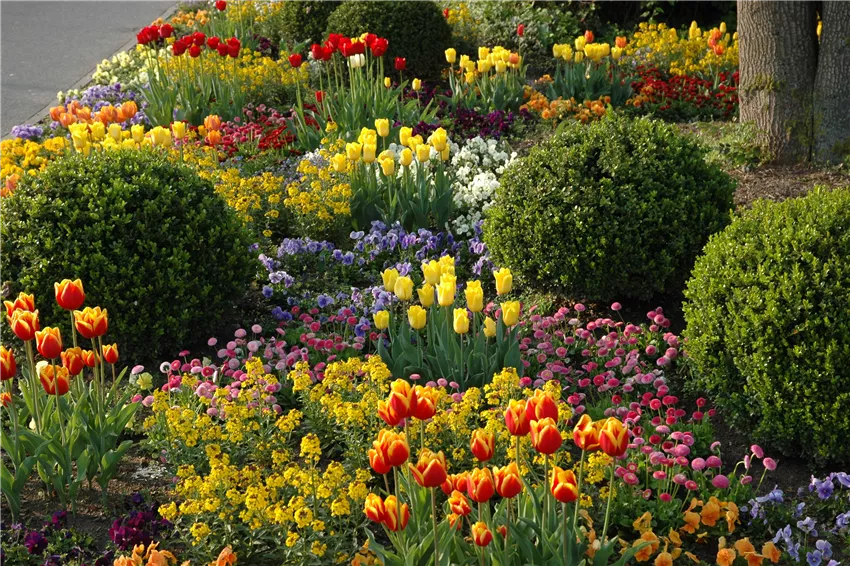 Beet mit Tulpen und Buchskugeln Wer im Garten und auf dem Balkon nach den passenden Begleitpflanzen für Blumenzwiebeln und -knollen sucht, der wird schnell fündig. Denn es gibt die unterschiedlichsten Kandidaten, die neben den Blühwundern eine sehr gute Figur machen, ohne ihnen dabei die Show zu stehlen. So kann man sich den Garten ganz nach dem eigenen Geschmack gestalten.