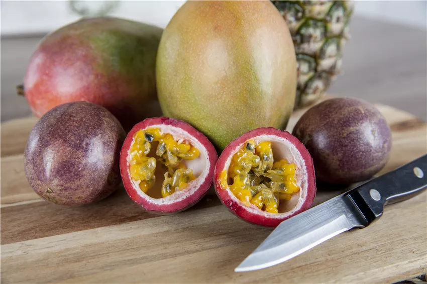 Passiflora edulis Mit Beerensträuchern, Apfel- oder Kirschbäumen ist der Gartenfreund das ganze Jahr über mit Vitaminen aus dem eigenen Garten versorgt. Es gibt doch nichts Schöneres, als die Früchte im eigenen Garten zu ernten, leckere Marmeladen oder Kompotte zu kochen und sich schon während der Ernte täglich eine Extraportion Vitamine zu gönnen. Nirgendwo sonst schmecken die Vitamine so gut. Frisch vom Strauch oder Baum gepflückt sind noch alle Vitamine und Aromen enthalten. Jeder Gärtner weiß, dass man so etwas nicht kaufen kann! Aus den getrockneten Blättern der Himbeersträucher lässt sich zudem ein leckerer Tee zubereiten, der auch wunderbar mit getrockneten Früchten ergänzt werden kann. Himbeeren, Brombeeren und vor allem Johannisbeeren sind wahre Vitamin C-Bomben, aus denen sich zahlreiche schmackhafte Leckereien zaubern lassen. Im Winter schmecken gezuckerte Geleefrüchte, im Herbst gönnt sich der Gärtner seinen selbst kreierter Beerenlikör und im Sommer gibt es eine Beeren-Sahne-Torte mit Beeren frisch vom Strauch. Da wird der Gärtner doch gleich für all seine Arbeit belohnt. Vielleicht darf es ja dann im nächsten Jahr gleich ein Beerenstrauch mehr sein.