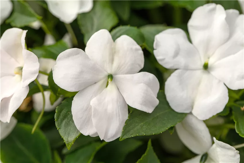 Impatiens walleriana, weiß Sie sind die Stars im Sommer und sorgen mit ihren bunten Blüten eine ganze Saison lang für gute Laune und Sommerfeeling. Aber muss man einjährige Beet- und Balkonpflanzen schneiden, damit sie prächtiger blühen? Fakt ist: Einjährige Pflanzen sind nur für ein Jahr für Beet und Balkon geeignet und sterben danach. Was erstmal tragisch klingt, ist eigentlich gar nicht so schlimm, denn dadurch kann man sich jedes Jahrs aufs Neue die buntesten Farben auf den Balkon und in den Garten holen. Einjährige Pflanzen schneiden macht also in Bezug auf einen Rückschnitt, wie man ihn im Frühjahr oder Herbst bei Laubgehölzen oder Stauden und Gräsern vornimmt, keinen Sinn. Denn die Pflanzen würden ohnehin im nächsten Jahr nicht wieder austreiben. Was aber Sinn macht ist ein minimaler Rückschnitt, um die Blütezeit zu verlängern. Denn wer beim Beet- und Balkonpflanzen schneiden immer wieder Verblühtes und Vertrocknetes entfernt, sorgt dafür, dass die Pflanze ihre Energie in die Bildung neuer Blüten steckt. Damit kann man den Sommer oft noch bis in den Herbst hinein verlängern und die Sommerromanze der einjährigen Pflanzen für Beet und Balkon noch ein kleines bisschen länger genießen.
