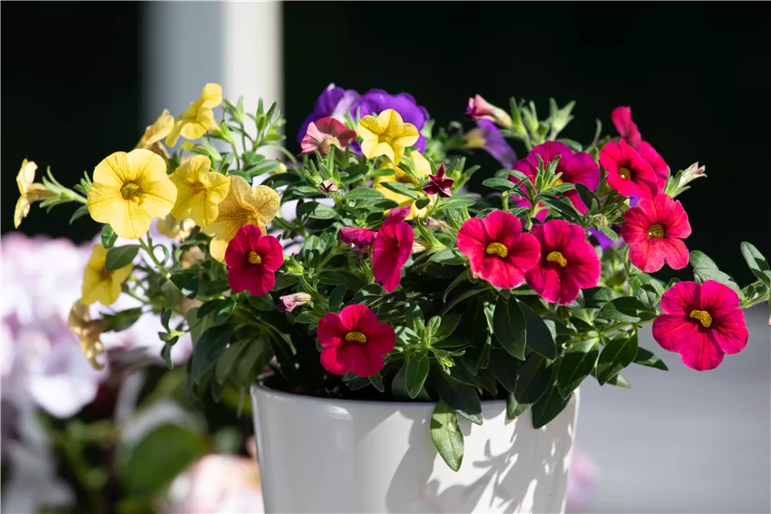Calibrachoa 'Trio' Was wären Balkon und Terrasse ohne hübsche Blüten und Düfte? Vor allem in der Saison vom späten Frühjahr bis in den Herbst überzeugen Balkonpflanzen mit ihren besonderen Eigenschaften. Die absoluten Klassiker für Kübel auf Balkon und Terrasse sind Geranien, Petunien und Zauberglöckchen. Sie blühen unermüdlich den ganzen Sommer über und machen aus dem wenigen Platz beim Urban Gardening eine echtes Blütenmeer. Zusammen mit Nutzpflanzen kann man sich hier eine Wohlfühloase schaffen, bei der man einen großen Garten gar nicht mehr vermisst. Im Sommer einen warmen Tag auf der Terrasse oder auf dem Balkon inmitten von Blüten, Düften und Snacks verbringen – wer braucht da noch Urlaub? Wer es besonders dufte mag, kann auch Lavendel, Ziersalbei und sogar Rosen im Kübel kultivieren. Wichtig ist aber auch beim Urban Gardening die Standortwahl. Denn jede Pflanze sollte für ein optimales Wachstum den Standort bekommen, an dem sie sich am wohlsten fühlt. Und dann steht der kleinen Oase auf Balkon und Terrasse nichts mehr im Wege. Ein kleiner Tipp: Bienenfreundliche Pflanzen locken Insekten an, die gerade bei Nutzpflanzen wichtig sind und eine leckere und erfolgreiche Ernte garantieren!