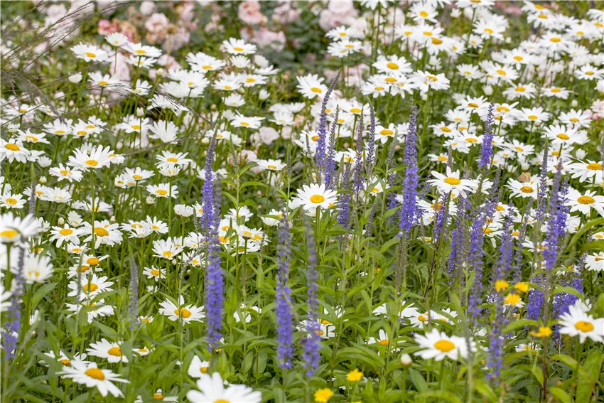 Leucanthemum x superbum Bei der Zusammenstellung von Pflanzen für ein Beet ist auf die Ansprüche an den Standort zu achten. Wählt man Sonnenstauden für einen freien Platz im Garten, wird man feststellen, dass diese Pflanzen nicht nur in den Standortansprüchen zueinander passen, sondern auch optisch gut harmonieren. Nicht ohne Grund sollte man daher bei der Gartengestaltung natürliche Pflanzengesellschaften zum Vorbild nehmen, die man dann nach den eigenen Wünschen arrangiert. Wer sich zum Herbst hin noch an schönen Blüten erfreuen möchte, kann sich zum Beispiel für eine sogenannte Präriepflanzung entscheiden, die sich an natürlichen Pflanzengesellschaften orientiert. Hier harmonieren unter anderem der Sonnenhut mit Sonnenbraut und Liebesgras sowie die Prärielilie und die Arkansas-Scheinaster an einem sonnigen Ort mit eher feuchtem, nährstoffhaltigem Boden.