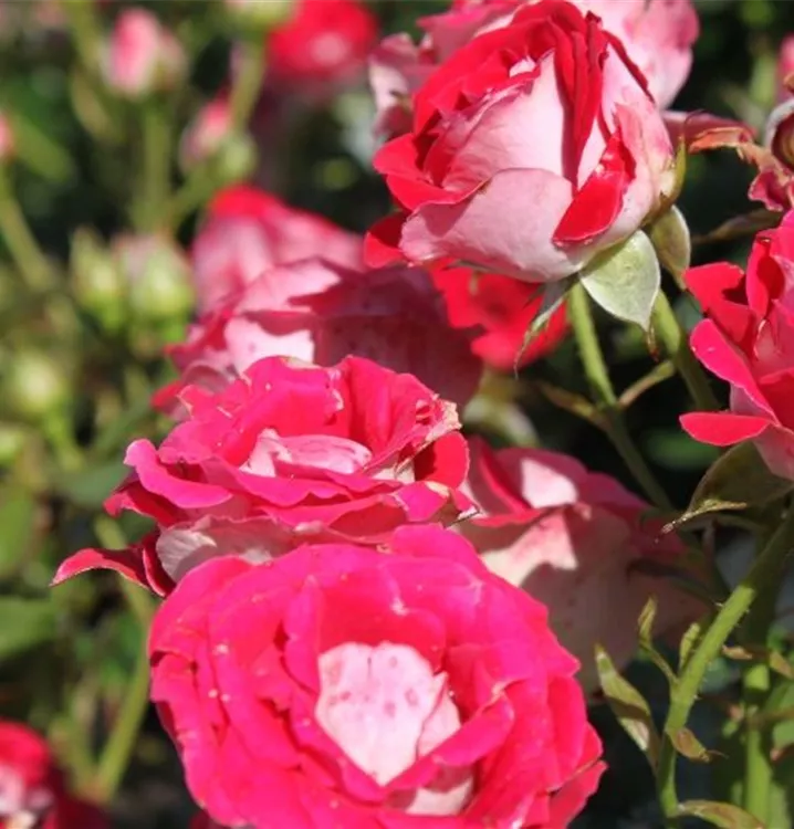 Die rot-weißen, starkgefüllten, schalenförmigen Blüten der Beetrose 'Schöne Koblenzerin'® erscheinen in Dolden von Juni bis September. Diese werden etwa 3 - 4 cm groß.