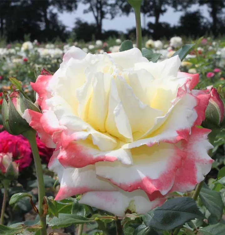 Die Edelrose 'Athena'® (Rosa) ist eine reichblühende Rose, die im Garten eine besondere Rolle spielt. Die zahlreichen gefüllten Blüten sind cremeweiß-rosa und erscheinen von Juni bis Oktober. Ihr wunderbarer Duft entfaltet sich besonders an sonnigen, warmen Tagen. Mit den richtigen Begleitern an ihrer Seite, kommt die Königin der Blumen besonders gut zur Geltung. Niedrige Stauden, Lavendel und Salbei eignen sich ganz gut für diese Zwecke.