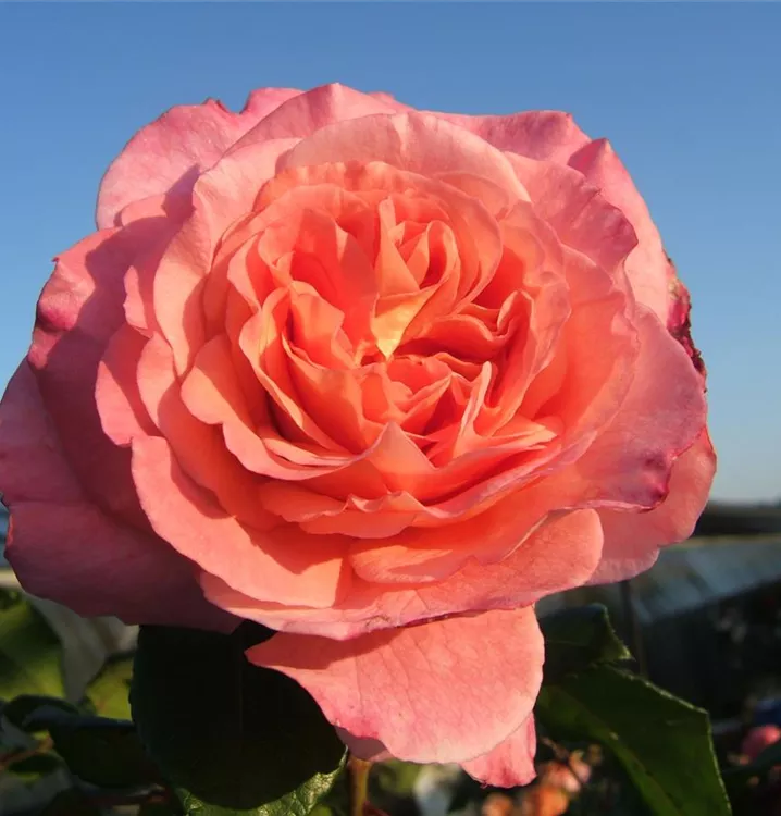 Die lachsrosafarbenen, schalenförmigen Blüten sind starkgefüllt und erscheinen von Juni bis Oktober. Diese werden etwa 10 - 12 cm groß und sind stark duftend.