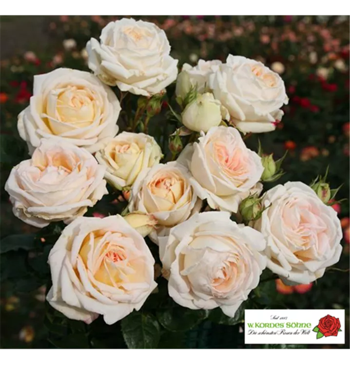 Die cremeweißen, schalenförmigen Blüten sind starkgefüllt und erscheinen von Juni bis Oktober. Diese werden etwa 6 - 8 cm groß und sind stark duftend.