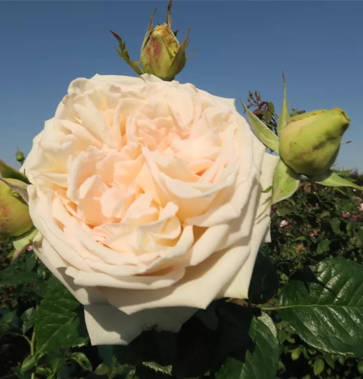 Die Edelrose 'Madame Anisette'® (Rosa) ist eine reichblühende Rose, die im Garten eine besondere Rolle spielt. Die zahlreichen starkgefüllten Blüten sind cremeweiß und erscheinen von Juni bis Oktober. Ihr wunderbarer Duft entfaltet sich besonders an sonnigen, warmen Tagen. Mit den richtigen Begleitern an ihrer Seite, kommt die Königin der Blumen besonders gut zur Geltung. Niedrige Stauden, Lavendel und Salbei eignen sich ganz gut für diese Zwecke.