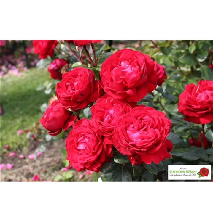 Die roten, schalenförmigen Blüten sind starkgefüllt und erscheinen von Juni bis Oktober. Diese werden etwa 8 - 10 cm groß und sind leicht duftend.