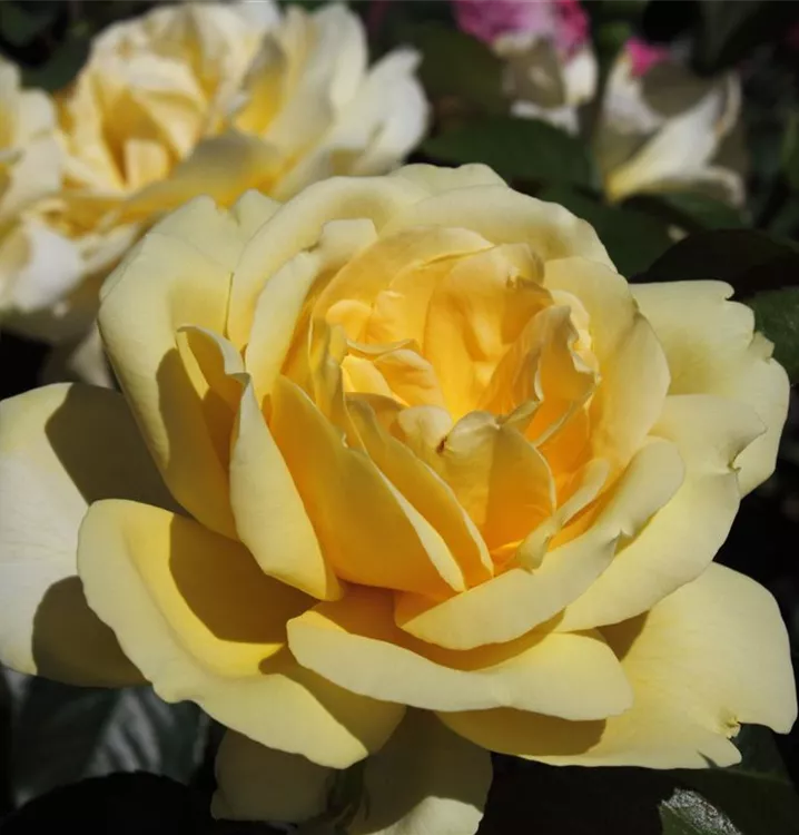 Die Edelrose 'Winter Sun'® (Rosa) ist eine reichblühende Rose, die im Garten eine besondere Rolle spielt. Die zahlreichen starkgefüllten Blüten sind hellgelb und erscheinen von Juni bis Oktober. Ihr wunderbarer Duft entfaltet sich besonders an sonnigen, warmen Tagen. Mit den richtigen Begleitern an ihrer Seite, kommt die Königin der Blumen besonders gut zur Geltung. Niedrige Stauden, Lavendel und Salbei eignen sich ganz gut für diese Zwecke.