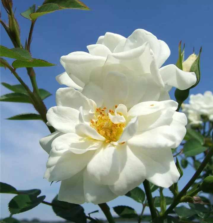 Die Bodendecker Rose 'Kent'® bildet weiße, gefüllte Blüten von Juni bis Oktober.