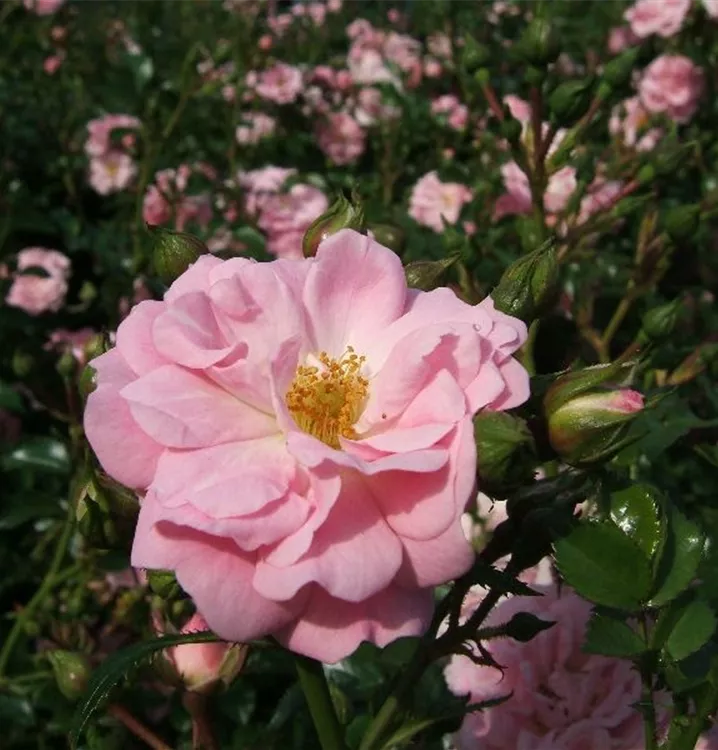 Die Bodendeckerrose 'Satina'® (Rosa) ist eine reichblühende Rose, die im Garten eine besondere Rolle spielt. Die halbgefüllten Blüten sind rosa und erscheinen zahlreich von Juni bis Oktober. Mit den richtigen Begleitern an ihrer Seite, kommt die Königin der Blumen besonders gut zur Geltung. Niedrige Stauden, Lavendel und Salbei eignen sich ganz gut für diese Zwecke.