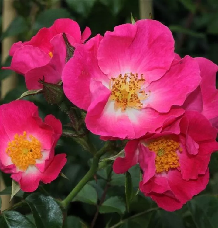 Die Kletterrose 'American Pillar' (Rosa) ist eine reichblühende Rose, die im Garten eine besondere Rolle spielt. Die zahlreichen Blüten sind pink und erscheinen von Juni bis Oktober. Ihr wunderbarer Duft entfaltet sich besonders an sonnigen, warmen Tagen. Mit den richtigen Begleitern an ihrer Seite, kommt die Königin der Blumen besonders gut zur Geltung. Niedrige Stauden, Lavendel und Salbei eignen sich ganz gut für diese Zwecke.