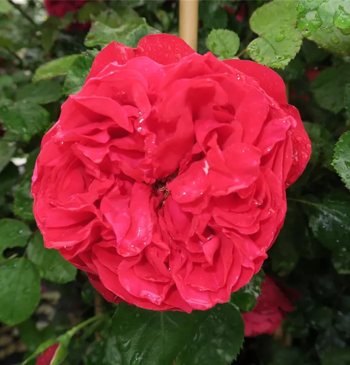Die roten, schalenförmigen Blüten sind starkgefüllt und erscheinen von Juni bis Oktober. Diese werden etwa 8 - 10 cm groß und sind angenehm duftend.