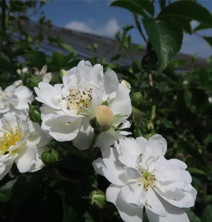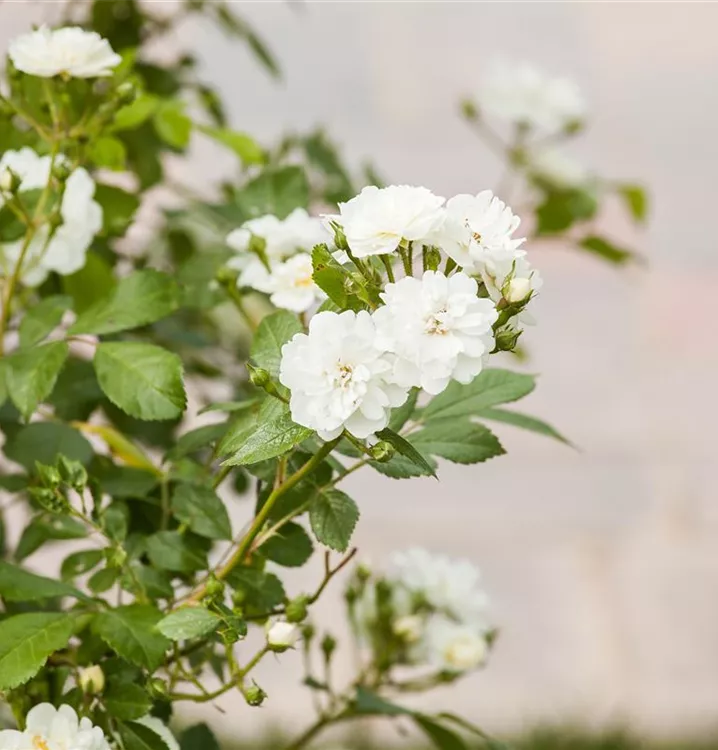 Die Kletterrose 'Guirlande d'Amour'® (Rosa) ist eine reichblühende Rose, die im Garten eine besondere Rolle spielt. Die zahlreichen Blüten sind weiß und erscheinen von Juni bis Oktober. Ihr wunderbarer Duft entfaltet sich besonders an sonnigen, warmen Tagen. Mit den richtigen Begleitern an ihrer Seite, kommt die Königin der Blumen besonders gut zur Geltung. Niedrige Stauden, Lavendel und Salbei eignen sich ganz gut für diese Zwecke.