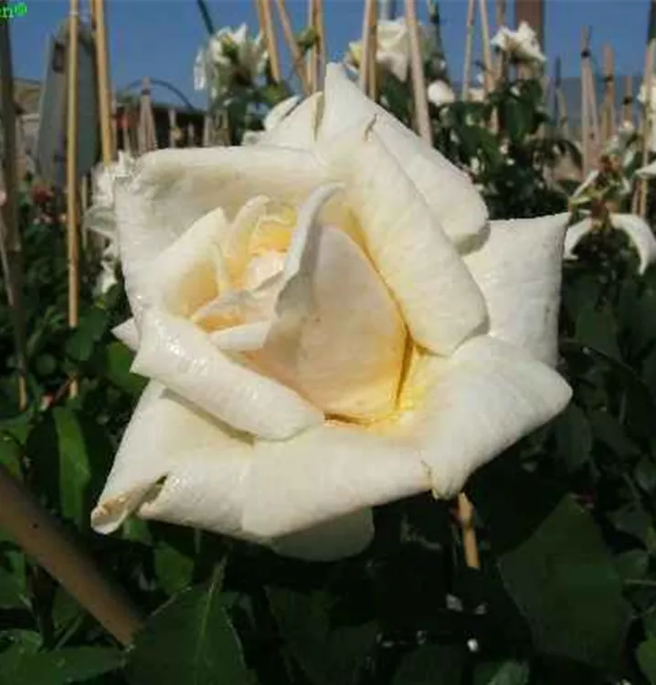 Die weißen, schalenförmigen Blüten sind starkgefüllt und erscheinen von Juni bis Oktober. Diese werden etwa 8 - 10 cm groß und sind angenehm duftend.