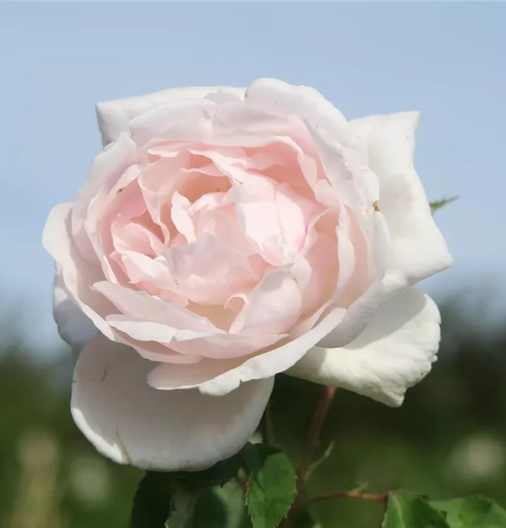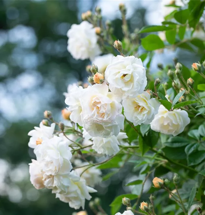 Die weißen, schalenförmigen Blüten sind starkgefüllt und erscheinen von Juni bis Oktober. Diese sind leicht duftend.