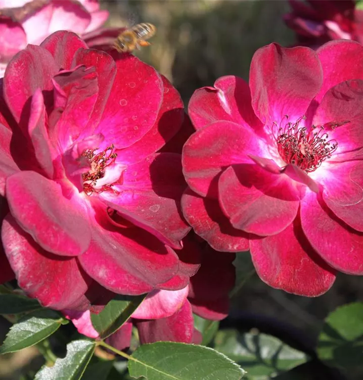 Die dunkelroten, schalenförmigen Blüten der Beetrose 'Burgundy Iceberg'® erscheinen in Dolden von Juni bis September.