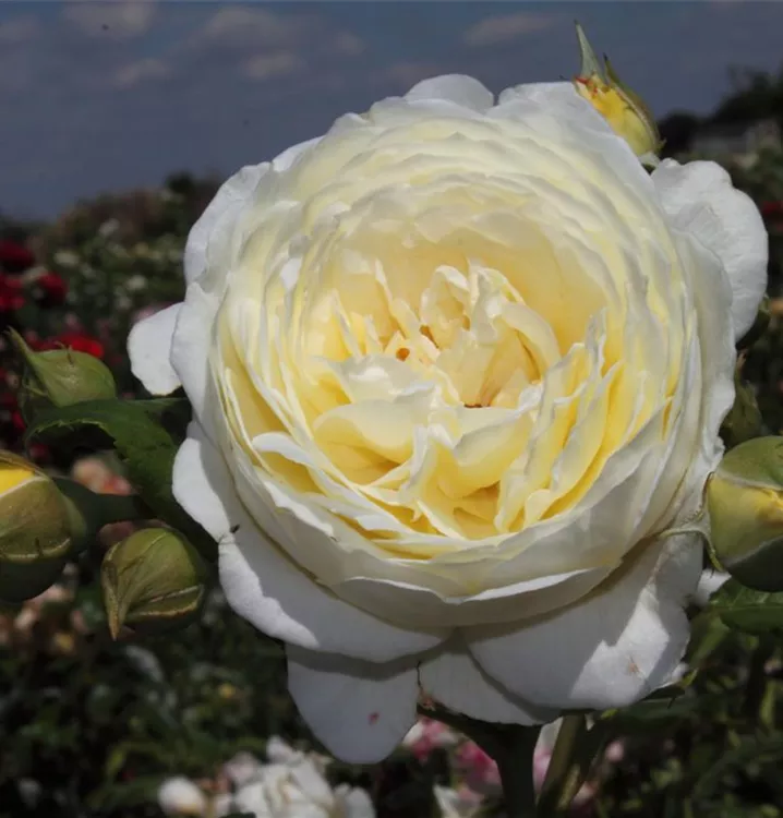 Die Strauchrose 'Claire Austin'® (Rosa) ist eine reichblühende Rose, die im Garten eine besondere Rolle spielt. Die zahlreichen gefüllten Blüten sind cremeweiß und erscheinen von Juni bis Oktober. Ihr wunderbarer Duft entfaltet sich besonders an sonnigen, warmen Tagen. Mit den richtigen Begleitern an ihrer Seite, kommt die Königin der Blumen besonders gut zur Geltung. Niedrige Stauden, Lavendel und Salbei eignen sich ganz gut für diese Zwecke.