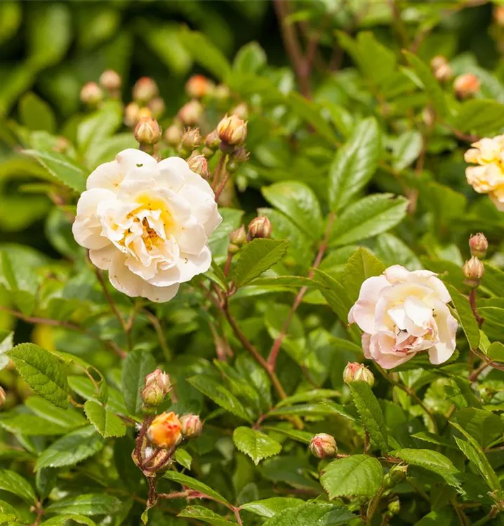 Die Strauchrose 'Ghislaine de Feligonde' (Rosa) ist eine reichblühende Rose, die im Garten eine besondere Rolle spielt. Die zahlreichen gefüllten Blüten sind cremeweiß und erscheinen von Juni bis Oktober. Ihr wunderbarer Duft entfaltet sich besonders an sonnigen, warmen Tagen. Mit den richtigen Begleitern an ihrer Seite, kommt die Königin der Blumen besonders gut zur Geltung. Niedrige Stauden, Lavendel und Salbei eignen sich ganz gut für diese Zwecke.